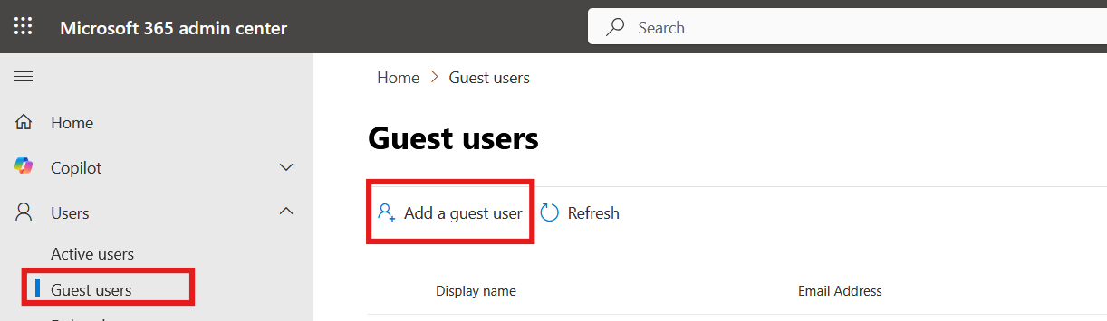 - Add a guest user > Invite user> Add a new user (our provided account).