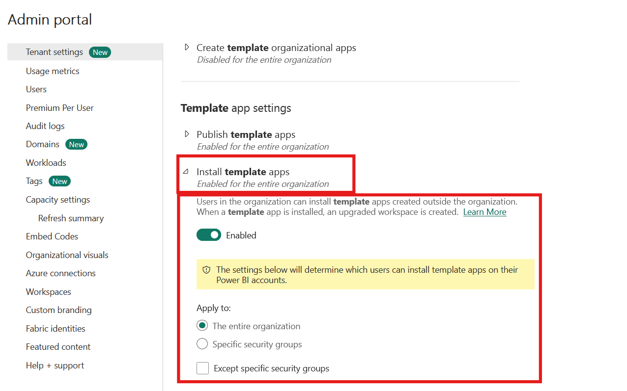 To allow installation of template apps, changes need to be made in the Power BI admin portal.